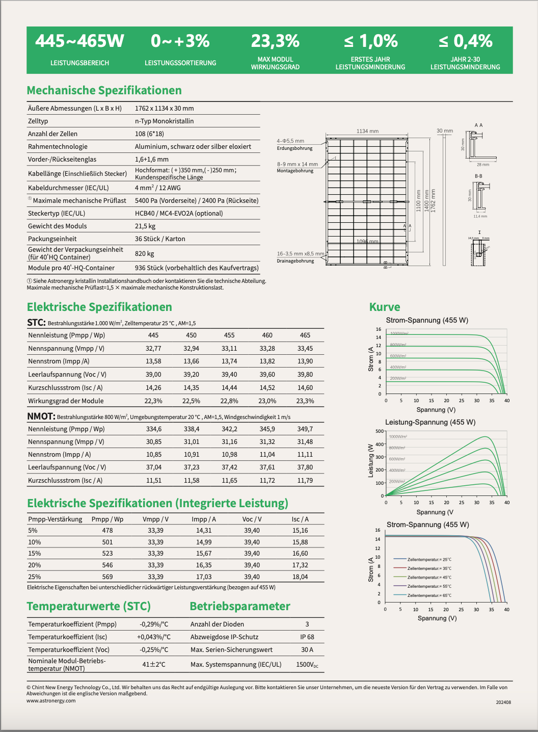 Natężenie promieniowania: 1000 W/m2 - Temperatura ogniwa: 25 °C - Widmo AM1.5 - NOCT 800 W/m2– Właściwości elektryczne