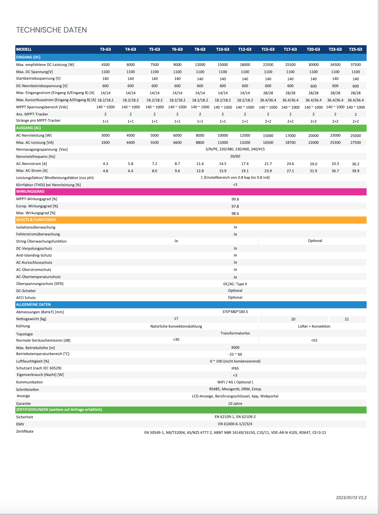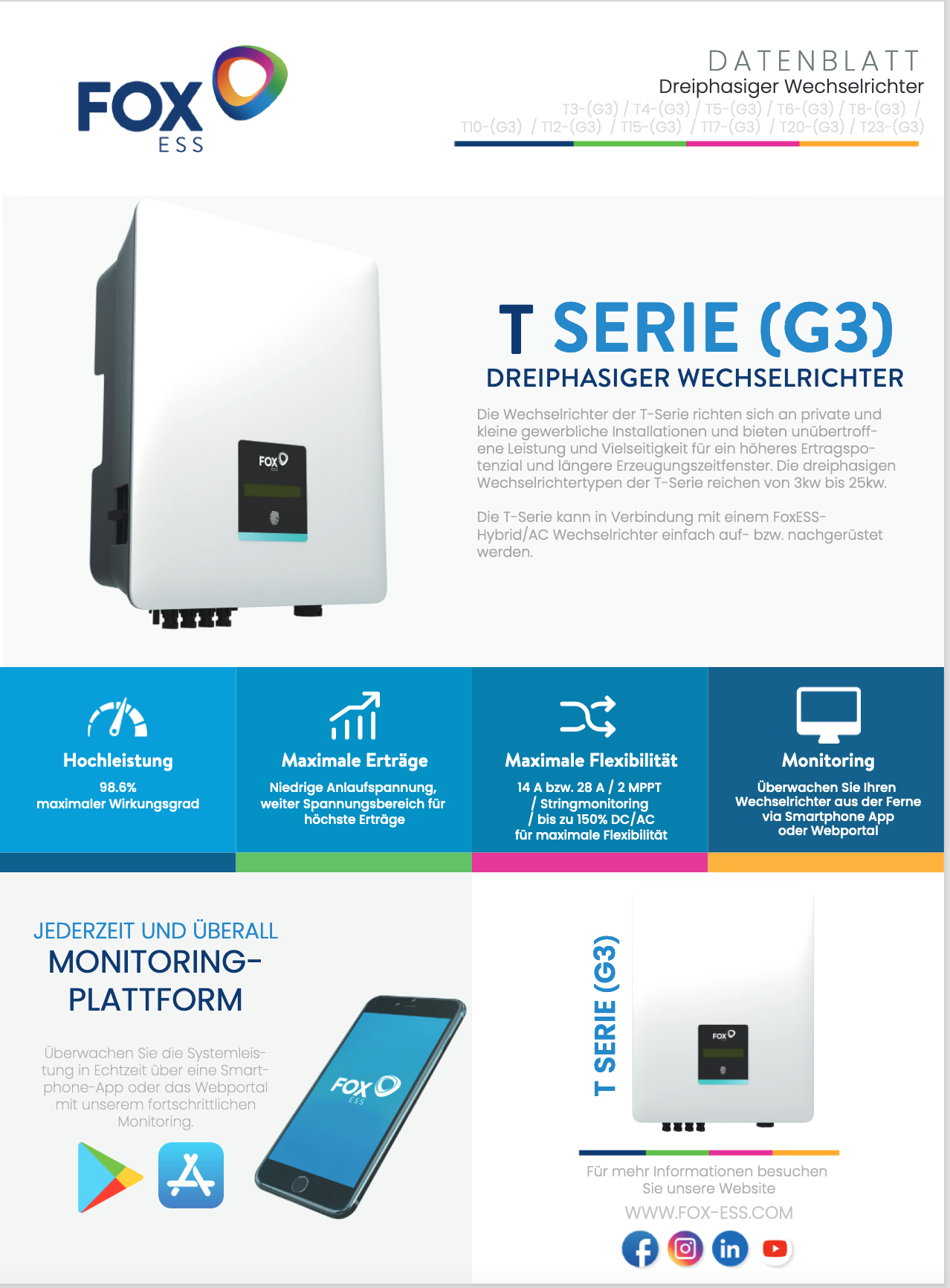 Przeznaczone do trójfazowych instalacji mieszkaniowych i małych instalacji komercyjnych, falowniki serii T oferują niezrównaną wydajność i wszechstronność, co przekłada się na wyższy potencjał wydajności i dłuższy czas generowania energii. Falowniki trójfazowe serii T mają opcje/pojemności mocy od 3 kW do 25 kW.